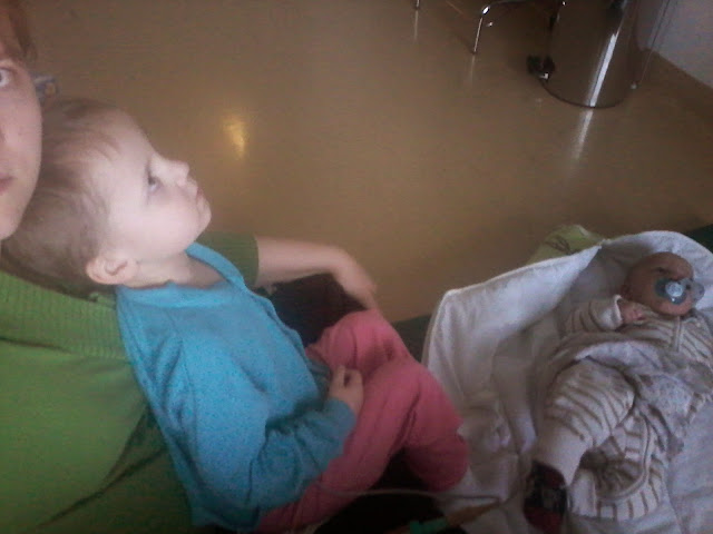 Torstaina menin jälleen Justuksen kanssa osastolle. Juuso voi hyvin ja viimeinenkin dreeni oli saatu irroitettua. Hetken päästä tuli kuitenkin hoitaja sanomaan, että meidän on poistuttava. Justus ei saa tulla osastolle. Kuulemma samat säännöt kaikille ja sen takia meidän kohdalla ei voida tehdä poikkeusta. Kieltämättä tämä selitys tuntui vähän ontuvan, kun juuri edellisellä viikolla oli toisen perheen kohdalla tehty poikkeus ja kun silloin kysyin asiasta sain vastauksen, että heillä on vähän erilainen tilanne ja sen takia he ovat poikkeuksellisesti saaneet vauvalle vierailuluvan. Siinä vaiheessa tuo "samat säännöt kaikille" kuulosti omaan korvaan lähinnä "halutaan tehdä teidän elämä nyt vaan vaikeaksi", vaikka eihän se tietenkään kenenkään tarkoitus ole missään vaiheessa ollut. Parhaaksi näkemällään tavalla kaikki ovat varmaankin toimineet. Se ei kuitenkaan omaa oloa siinä kohti lohduttanut. Lähdettiin sitten samantien leikkiosastolle. Itse olin todella väsynyt siinä kohti ja pääsi itku. Tiesin kuitenkin, että Juusolle ne yhteiset iltatoimet ovat olleet todella tärkeä juttu ja, että juuri iltaisin Juuso kovasti ikävöi.
