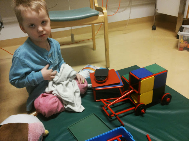 Lauantaina käytiin Juuson kanssa kardiologin kontrollissa Kokkolassa. Tiistaina oli otettu labrat ja nyt sitten käytiin ennen lääkärille menoa keuhkokuvassa. Ajat olivat jonkun verran myöhässä ja tunnin verran Juuso ehti rakennella jättiläispalikoilla ennen vuoroamme.